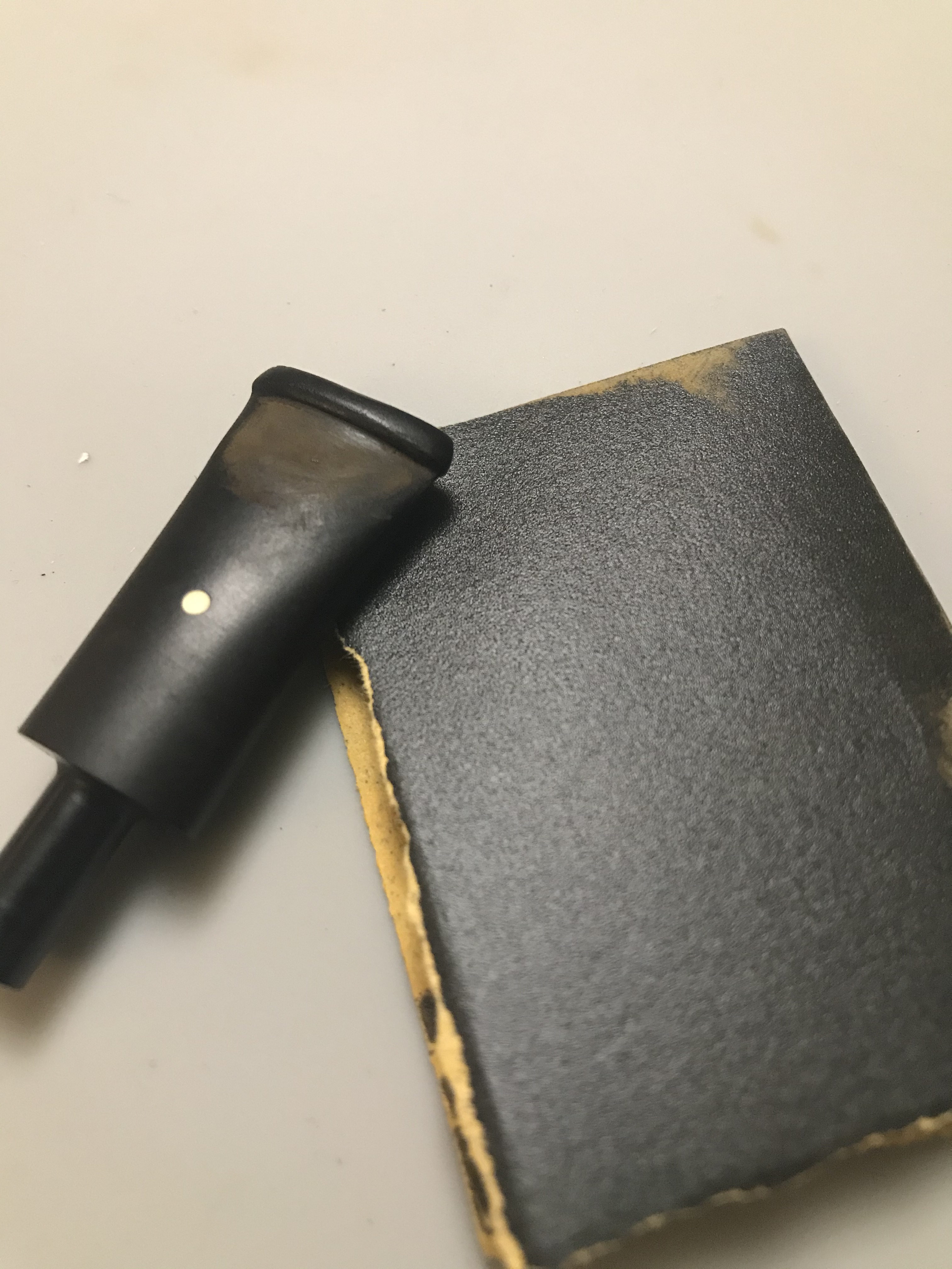 I attempted to lift the tooth dents out using my heat gun. I was able to lift some of the tooth dents out, what remained would have to be repaired. I used Rubber Toughened CA glue to rebuild the button and the bite area. I used hobby files to shape the end of the stem, afterwards I sanded the stem from 320-1000 grit, then switched to micro mesh sanding pads from 1500-12,000 grit.